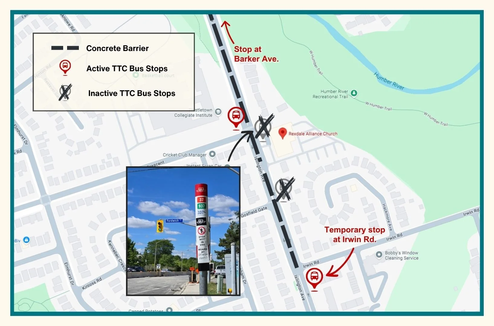 For northbound travellers: The stops at Gosfield Gate and Fordwich Cres have been closed. A temporary stop has been add on the south side of Irwin Rd. The sidewalks is open for commuters to walk to/from this stop along the east side of Islington Ave.